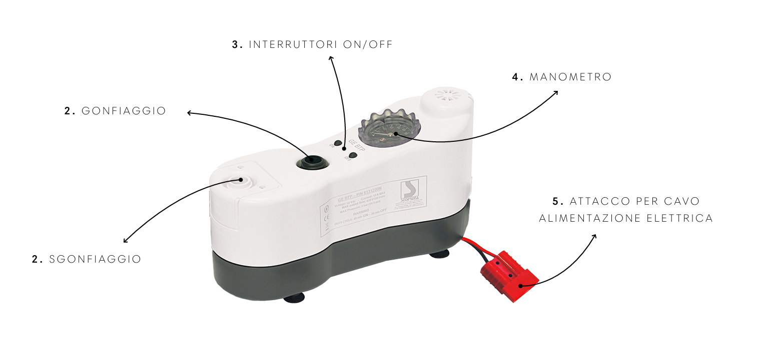 Gonfiatore Scoprega GE BTP-2 con arresto automatico alla pressione selezionata tramite manometro con scala in bar e psi. Può gonfiare o sgonfiare. Completo di filtro di aspirazione, raccordi universali, sacca con tracolla, tubo da 1,70 metri e 3 metri di cavo. Alimentazione con attacco presa Anderson oppure con morsetti per batteria.