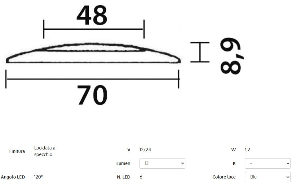 Finitura in acciaio inox lucidato a specchio e lente in policarbonato. Fissaggio tramite viti nascoste dal frontalino.