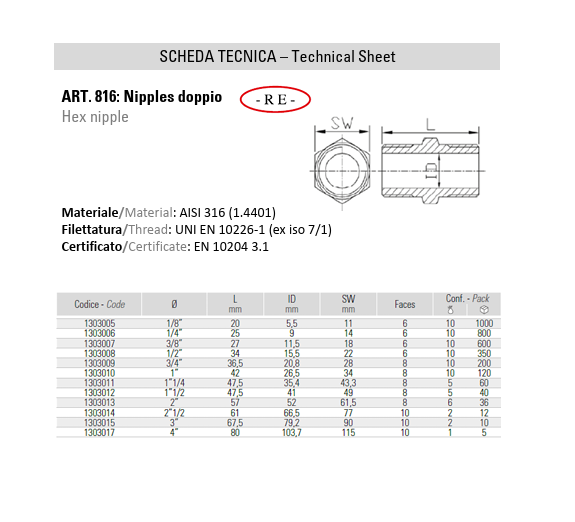 Normativa: EN 10204 3.1, filetto UNI EN 10226-1 (ex iso 7/1)