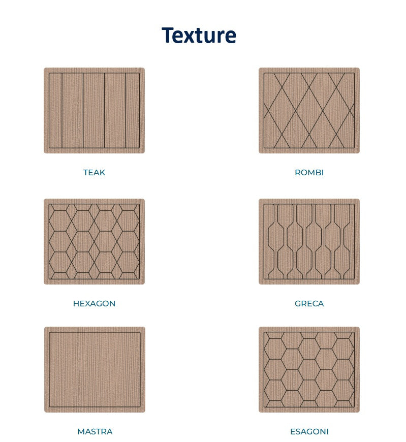 L’EVA di ItalDek può essere caratterizzato da tre texture differenti: liscia, spazzolata e diamantata.