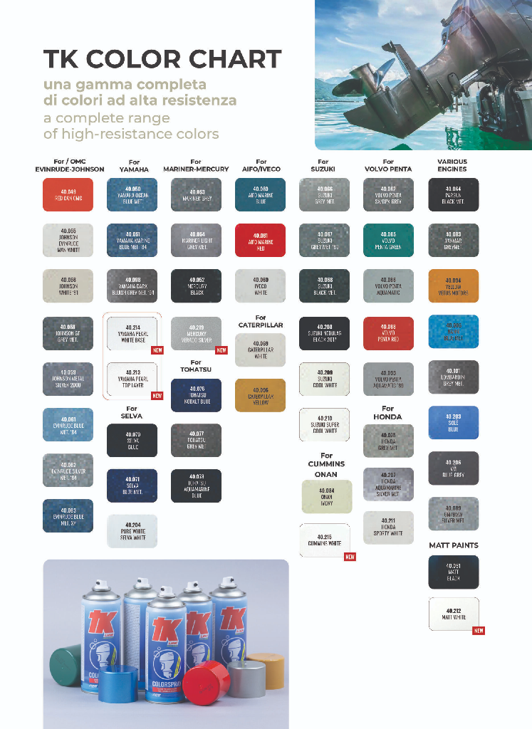 Le vernici spray TK per motori marini sono prodotti ideali per proteggere e verniciare le superfici metalliche, il piede o la calandra dei motori esposti all’ acqua salata ed agli agenti atmosferici. Sono formulate con resine e pigmenti di alta qualità, che garantiscono un’ottima adesione, una elevata resistenza alla corrosione, brillantezza. Queste vernici spray sono facili da applicare, asciugano rapidamente, consentendo di ridurre i tempi di lavoro, sono inoltre resistenti agli urti, alle abrasioni, alla temperatura ed ai raggi UV, garantendo una protezione duratura nel tempo. TK COLORSPRAY è disponibile nei colori originali dei motori marini entro e fuoribordo più diffusi.